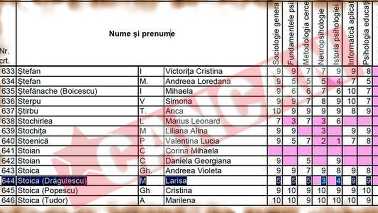 ESEC. Acestea sunt notele Larisei dupa sesiunea de iarna INCERCARE. Dupa bataia incasata de la fostul sot, Larisa Dragulescu si-a revenit si are de gand sa traga tare pentru a-si lua restantele Fosta sotie a sportivului nu se descurca foarte bine la Facultatea de Psihologie, unde situatia notelor sale este critica, punand totul pe seama scandalurilor avute cu Marian. Ionut Brandusa Tentativa acesteia de a deveni un psiholog cu acte in regula pare a fi departe de a se concretiza. Asta pentru ca sesiunea de iarna a studentei Larisa Dragulescu a reprezentat un fiasco total. Daca la materii precum „Sociologie”, „Fundamentele psihologiei” si „Metodologia psihologiei” Larisa a reusit sa smulga cinciul de trecere, la „Istoria psihologiei”, plus „Neuropsihologie” resiteanca a picat fara emotii cu un trei si cu patru. Altfel, pe final, victima lui Marian Dragulescu a reusit sa isi imbunatateasca situatia cu doua note de noua la „Informatica aplicativa” si „Psihologia educationala”, dar la ultimul examen, „Engleza”, a ales sa nu se prezinte. Colegii Larisei spun ca situatia dificila de la facultate a acesteia este cauzata de scandalul monstru avut cu Marian Dragulescu, atunci cand in mai putin de sase luni a incasat-o de doua ori de la sportiv. Conform apropiatilor, blonda nu a fost singura pe tot parcursul sesiunii de iarna, fiind incurajata la fiecare examen de catre Fabio, artistul alaturi de care s-a lansat in muzica.