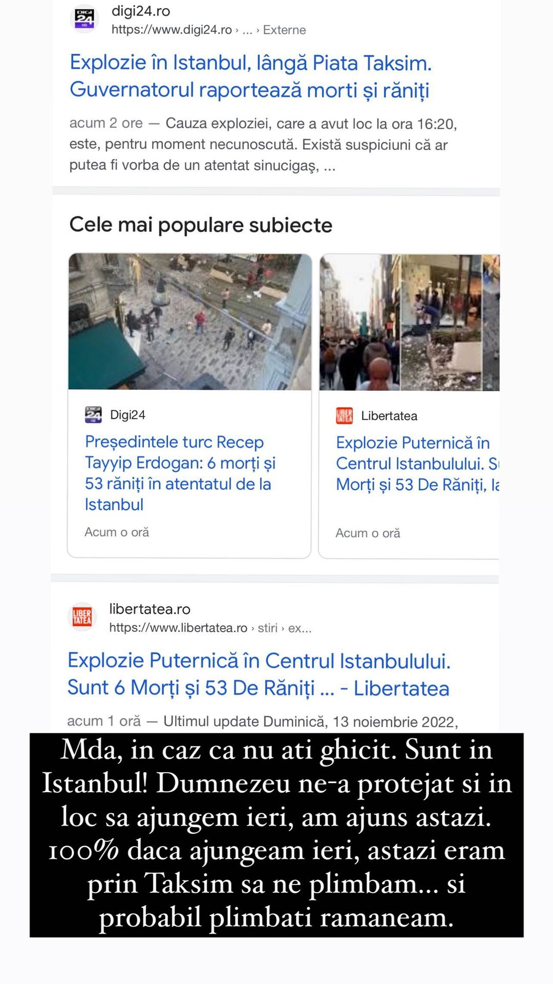 „Mda, în caz că nu ați ghicit. Sunt în Istanbul! Dumnezeu ne-a protejat și în loc să ajungem ieri, am ajuns astăzi. 100% dacă ajungeam ieri, astăzi eram prin Taksim să ne plimbăm…și probabil plimbați rămâneam”, a povestit Larisa Udilă, pe Instastory.