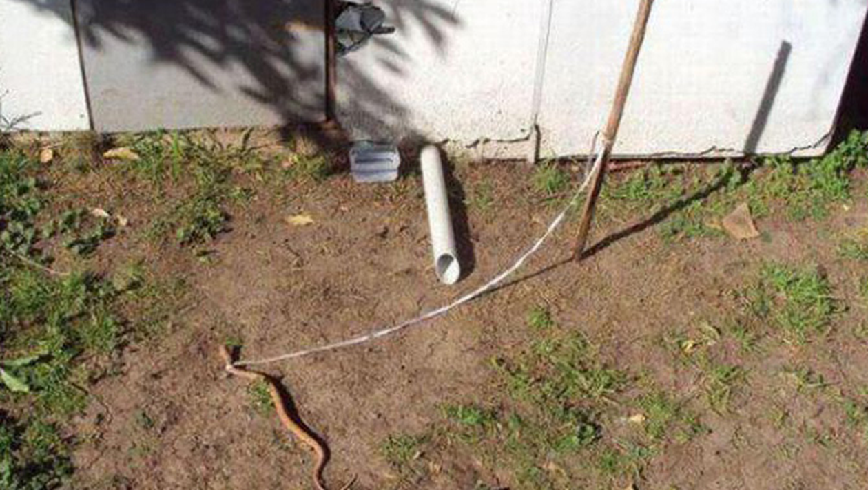 Pentru ca s-o fi saturat saracul om ca batatura lui sa tot fie calcata de hoti si cainele sa nu faca nimic in privinta aceasta, un roman a decis ca este timpul sa isi ia un nou paznic. Si a gasit unul inedit: a legat un pui de sarpe cu o ata de gat si apoi de cotetul fostulu caine, probabil. Acum mai trebuie doar sa il hraneasca pentru a deveni mai mare si un adversar de temut pentru cei ce vor sa intreaca masura!