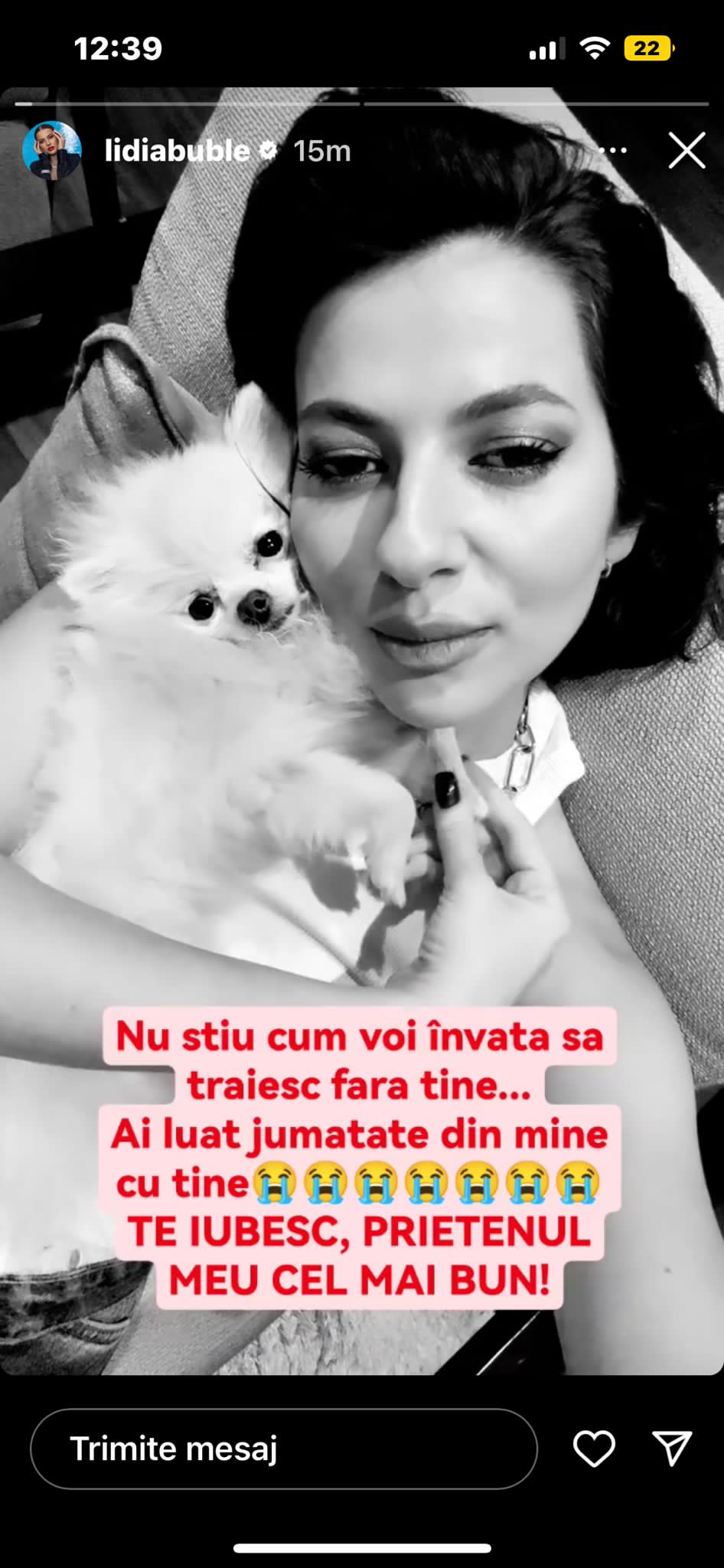Zi tristă pentru Lidia Buble. Bubbly, cel mai bun prieten al cântăreței, a murit în această dimineață. Patrupedul avea doar 4 ani.