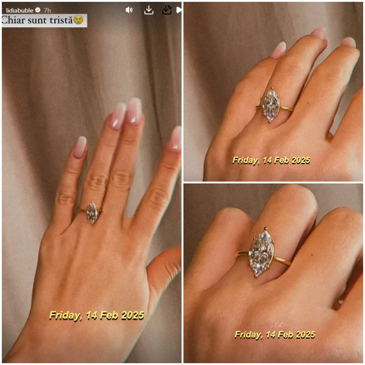„De ieri sunt foarte tristă, pentru că zicea la horoscop că Gemenii astăzi nu primesc cadouri. Că o să stăm să ne uităm la alții cum primesc și că asta este, că n-avem noroc. Bă, așa de rău îmi pare că ați avut dreptate. Deci, doamne… Chiar vă mulțumesc, să știți. E greu. E greu să fii Geamăn. E greu să stai să te uiți la alții cum primesc cadouri și… Hai, Happy Valentine’s Day, Gemenii mei!” a spus Lidia Buble în mediul online, în timp ce filma inelul strălucitor.