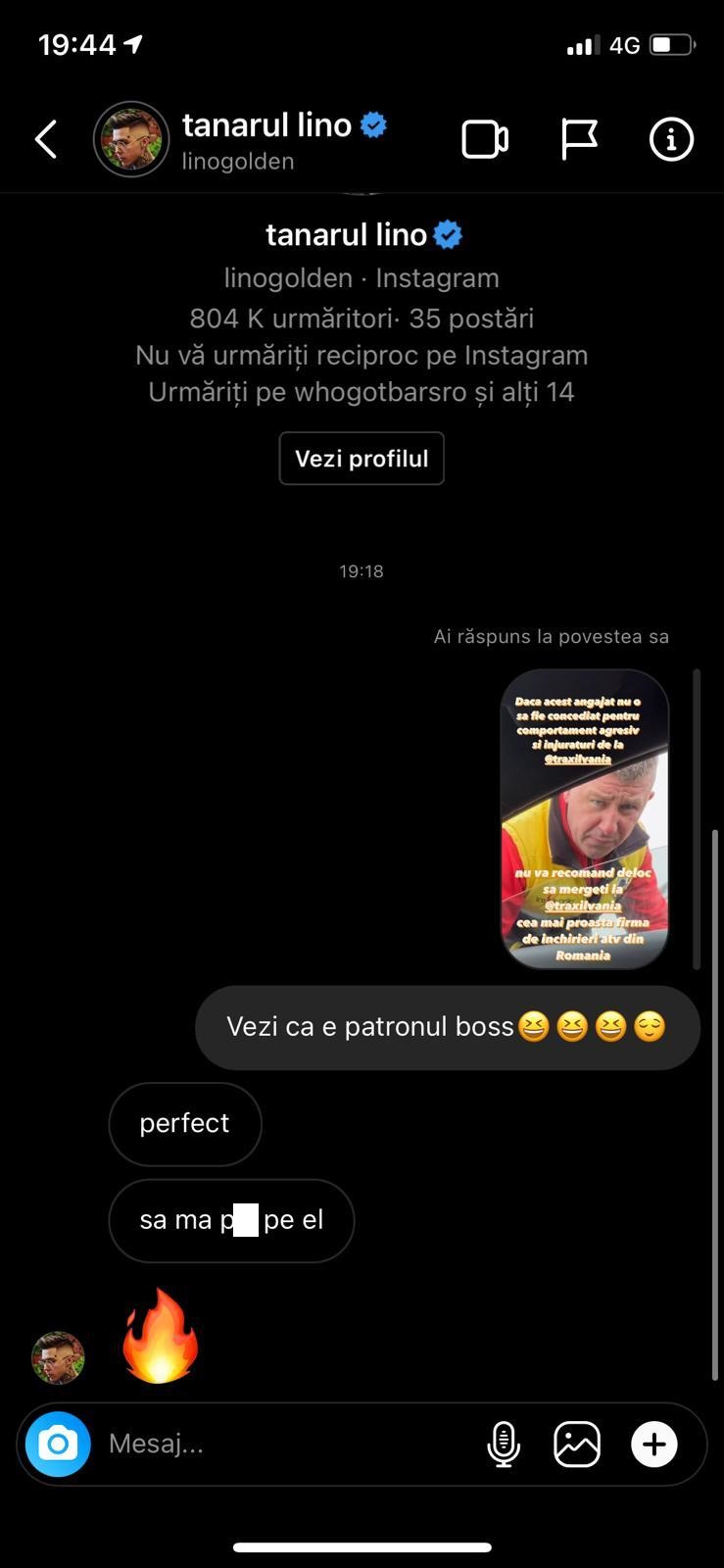 De parcă nu ar fi fost suficient, Lino Golden a postat pe Instagram o fotografie cu managerul firmei de închirieri, precum și un video în care îl numește, în limbaj trivial, „boschetar infect”. De asemenea, pentru ca bătaia de joc la adresa bărbatului care i-a refuzat barterul să fie una și mai mare, Lino Golden a postat pe OLX un anunț în care specifică faptul că vinde un telefon, iar numărul de contact pe care l-a atașat anunțului a fost cel al managerului de la firma de închirieri ATV-uri.