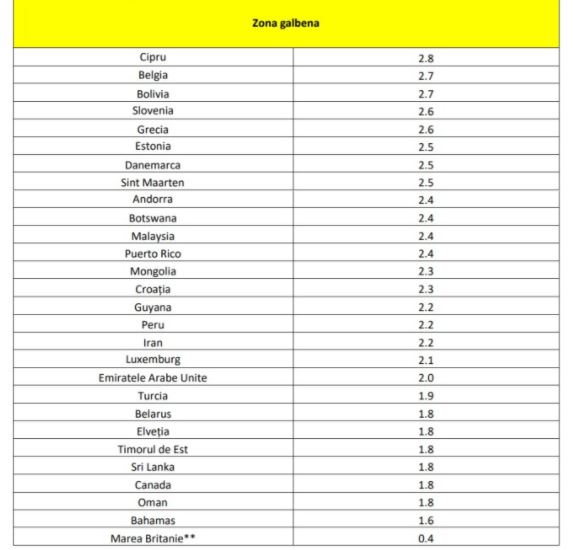 În total, pe lista roşie se află 23 de state, iar pe lista galbenă, 28 de ţări, între care unele dintre destinaţiile de vacanţă preferate de români.