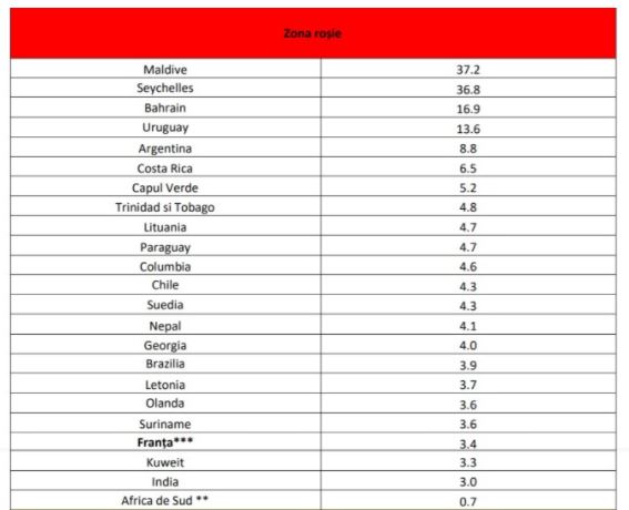 Oficialii din cadrul Comitetului Naţional pentru Situaţii de Urgenţă au aprobat în această seară lista statelor considerate cu risc epidemiologic. Franța, Olanda, Letonia, Lituania, Suedia, Costa Rica și Maldive sunt șapte dintre cele 23 de state aflate în zona roșie. Marea Britanie apare pe lista galbenă, deşi potrivit incidenţei s-ar situa în zona verde.