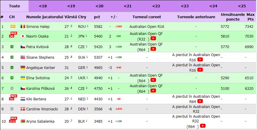 Sloane Stephens, Naomi Osaka şi Petra Kvitova o pot depăși pe Simona Halep, după ce românca a pierdut în fața Serenei Williams. Au nevoie să ajungă cel puțin în semifinalele turneului australian. Și Elina Svitolina şi Karolina Pliskova o pot face, dar ele trebuie să ajungă în finală.