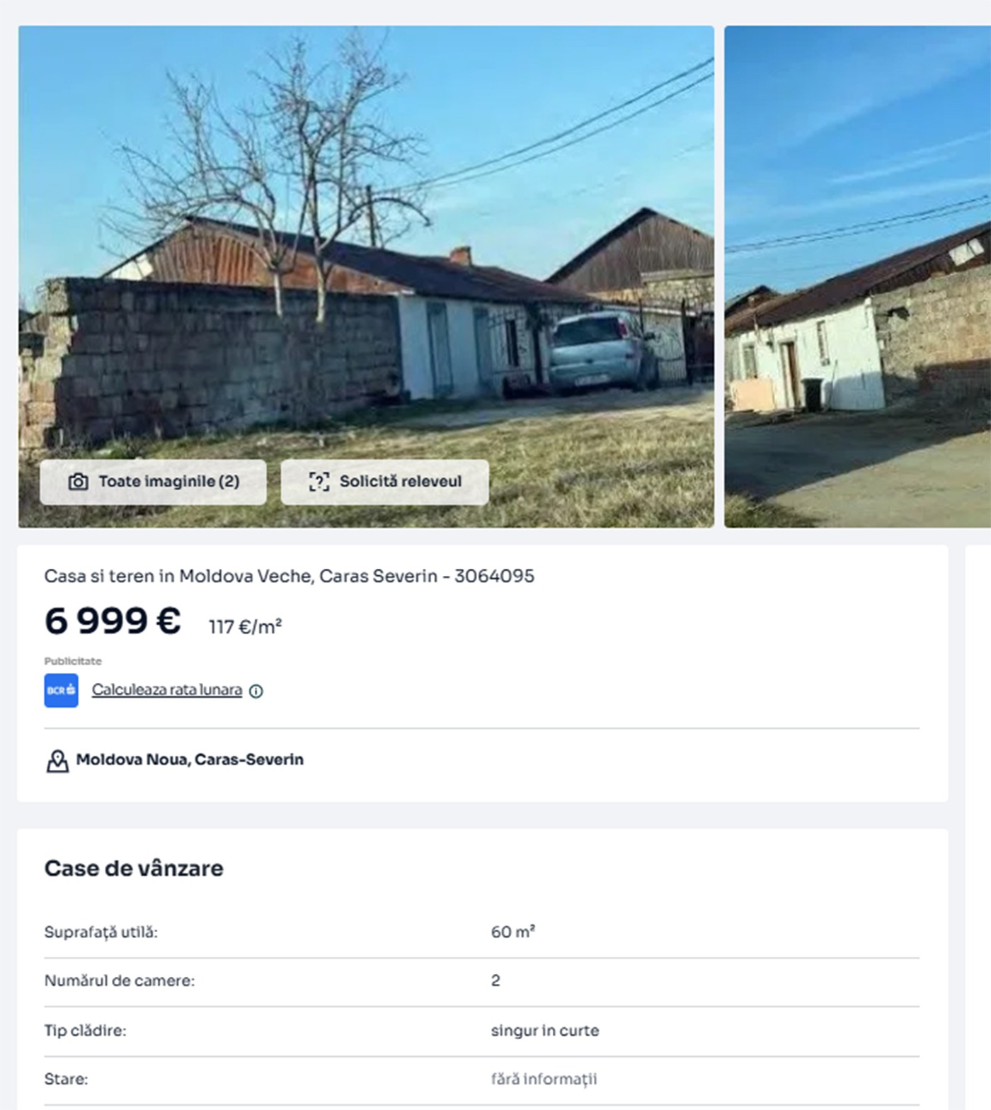 „Acest imobil se valorifică în cadrul unei licitații publice. Proprietate constituită din teren intravilan în suprafață de 104 mp și construcție edificata pe acesta în suprafață de 60mp, situate în Loc. Moldova Veche, Caras Severin. Locuința este în regim de înălțime P, construcție nefinalizată”, se arată în anunțul de vânzare.