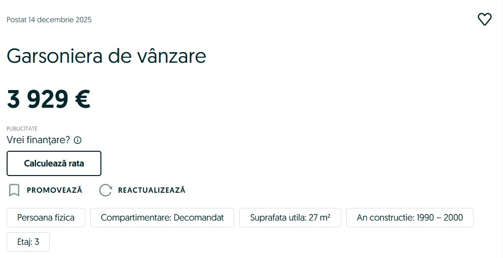 Aici, o garsonieră decomandată, cu o suprafață utilă de 27 de metri pătrați, este scoasă la vânzare pentru doar 3.929 de euro.
