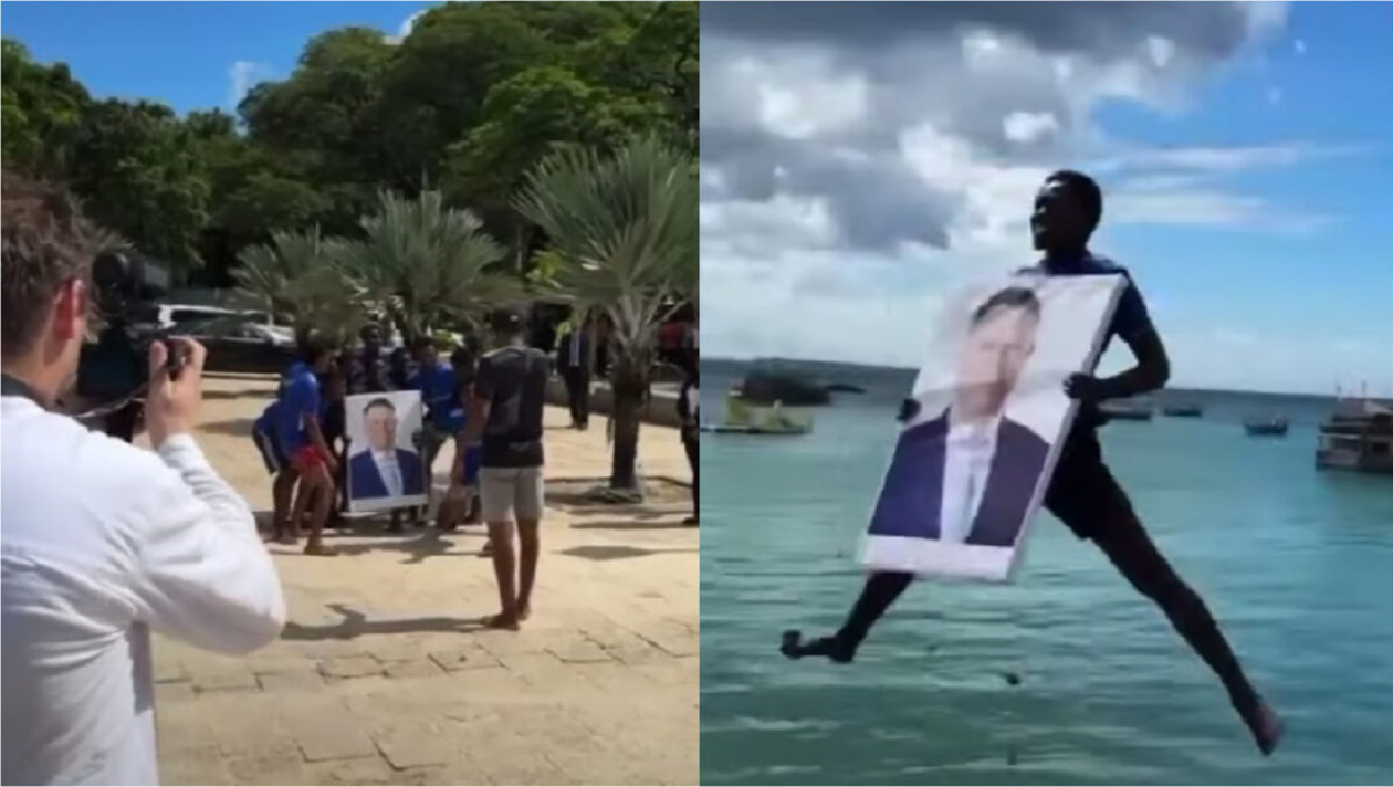 Momentul în care un localnic din Africa se aruncă în apă cu tabloul lui Klaus Iohannis/ Sursa foto: Captură Spot Media