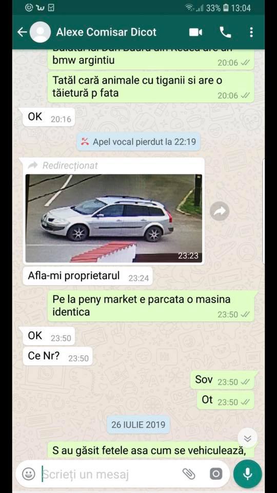 ”Atentiuneeeee! PROBA absoluta a incompetentei și prostiei poliției, care altfel ar fi putut salva aceasta fetița! La ora 23.23, la 12 ore de la apelurile Alexandrei, “militianul” numit Alexa, altfel Adj al Șefului poliției județene OLT, ii trimitea acest mesaj unui patron de firma de paza! Îl punea sa ii afle proprietarul masinii care o luase pe Alexandra! Deci ei nu mai aveau baze de date prin care sa verifice un vehicul înmatriculat, le epuizaseră și întrebau un privat! Va puteți imagina ce anchete făceau ăștia, in general, dacă ei nu erau in stare nici sa găsească o mașina, a carei culoare și marca o știau, intr-un orășel precum Caracal! Rezultatul tragic este ca negasirea la timp a acestei masini a dus la asasinarea fetei! De altfel a și recunoscut nemernicul de asasin lichidarea celor doua fete! Va spun eu de ce a recunoscut! Pentru ca are mai multe crime la activ și toată lumea vrea sa inchida cazul, cu ceea ce se știe deja și nu s-a mai putut “acoperi”! Ieri plutonierul de Coarna a încercat sa inducă opiniei publice ideea ca fetele sunt vii!!! Interesant! Oare ce manevra a încercat el sa facă? Acum va schimba argumentația și va debita o groaza de alte tâmpenii! Eu nu înțeleg totuși care e ideea? Sa apere derbedeii corupți de la Olt și Caracal, deja demiși? De ce ar trebui sa facă așa ceva? Poate răspundeti voi! Ciudat, f ciudat! Asta e România!”