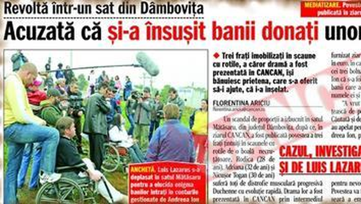 INTERES. Emisiunea in care Luis Lazarus a investigat cazul fratilor Togan a fost urmarita cu sufletul la gura de telespectatorii Prima TV Editia de luni a emisiunii de la Prima TV, in care s-a prezentat drama a trei frati imobilizati in scaunele cu rotile, mediatizata de ziarul nostru, a fost urmarita de aproape un milion si jumatate de romani. Florentina Ariciu Emisiunea „Tribunalul poporului” a atins un nou record de audienta prin prezentarea scandalului de proportii din judetul Dambovita, izbucnit dupa ce ziarul CANCAN a relatat, pe larg, povestea fratilor Togan. Tinerii in varsta de 28 de ani, 32 de ani, respectiv 30 de ani sufera toti de distrofie musculara progresiva, iar de drama lor a profitat chiar o prietena a acestora. Femeia a dat, pentru donatii, conturile proprii si nu ale bolnavilor, asa cum era normal. Echipa de la Prima TV, in frunte cu Luis Lazarus, a vrut sa faca dreptate in aceasta situatie incurcata. Initiativa lor, prezentata ieri seara, a fost urmarita cu sufletul la gura de peste 1.300.000 de romani. La doar 15 minute de la inceperea emisiunii, Lazarus atinsese un varf de rating de 6,1 puncte, devansand atat Antena 1, cat si TVR. Interesul publicului pentru cazul prezentat s-a mentinut toata emisiunea la 5 puncte de rating.