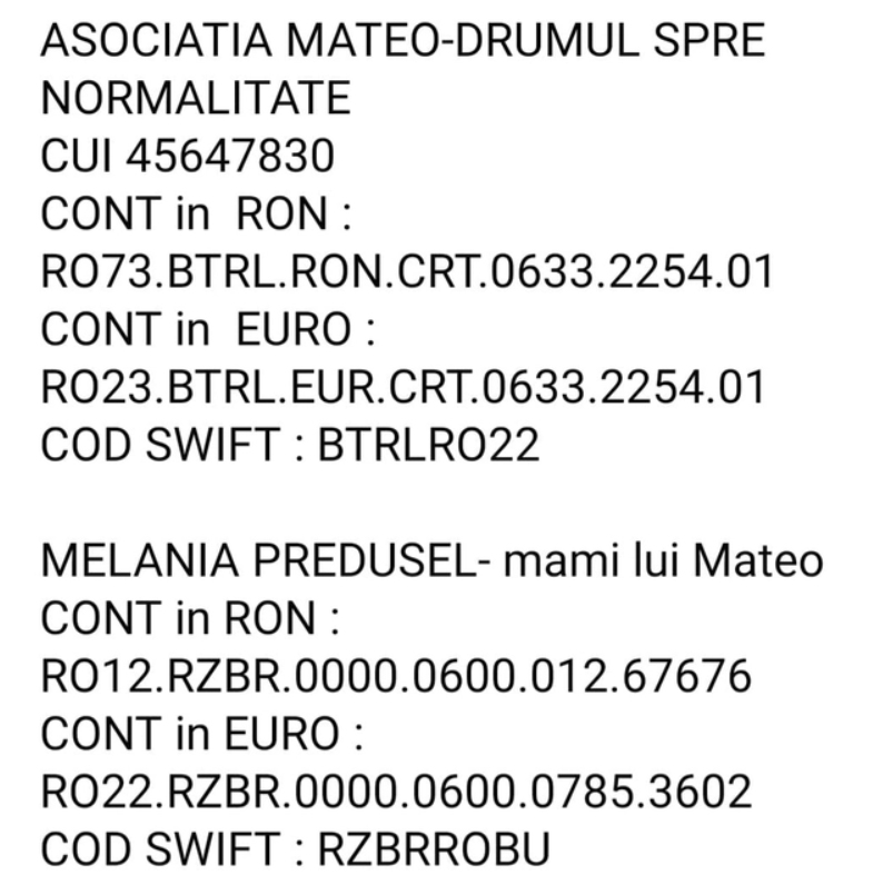 Cei care doresc să lupte, alături de mama sa, pentru Raiul lui Mateo și pentru însănătoșirea acestuia o pot face depunând bani într-unul din următoarele conturi: