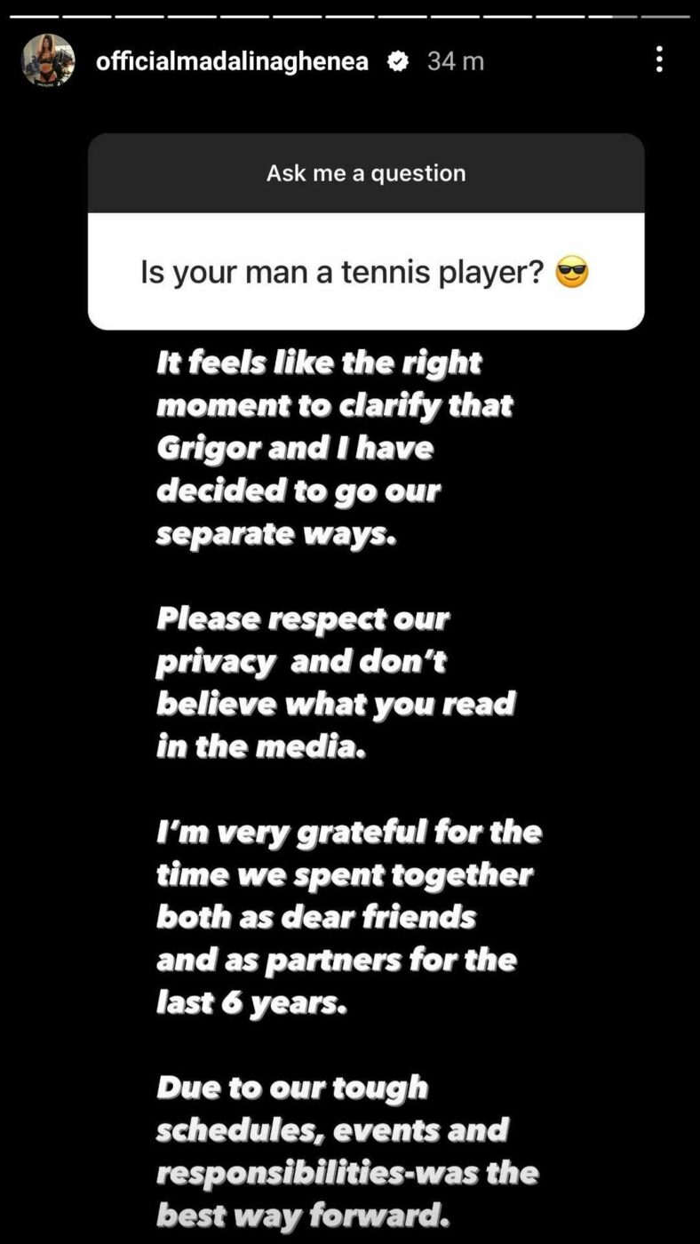 Vreme de șase ani, Mădălina Ghenea (36 de ani) și de jucătorul de tenis Grigor Dimitrov (32 de ani) au format un cuplu. Cei doi au avut parte de o relație frumoasă, însă în ultima perioadă lucrurile nu mai funcționau între ei. Așa că aceștia au decis să nu își mai piardă timpul unul altuia și să o apuce pe drumuri diferite. Cea care a făcut anunțul despărțirii a fost frumoasa româncă, iar vestea i-a bucurat pe mulți reprezentanți ai sexului tare.