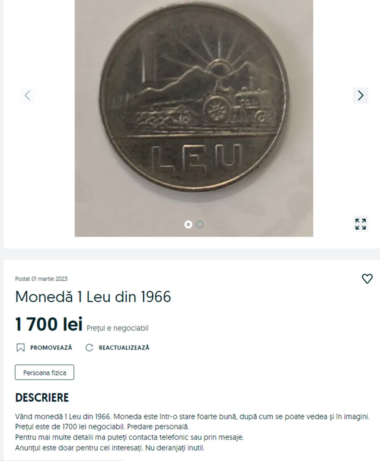„Vând monedă 1 Leu din 1966. Moneda este într-o stare foarte bună, după cum se poate vedea și în imagini. Prețul este de 1.700 lei negociabil. Predare personală”, se arată în anunțul postat de utilizator pe OLX.