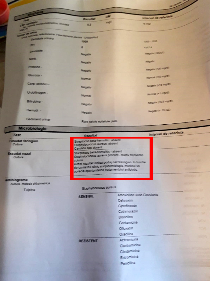 CANCAN.RO, site-ul nr. 1 din România, vă prezintă încă un un caz incredibil. “Am născut pe 29 septembrie la Maternitatea Giulești. În urma unor analize, prelevate în ziua în care am născut, mi-a ieșit bacilul spp. Ulterior, am citit că această bacterie se contractează din spital. Am început un tratament recomandat de medicul ginecolog. Medicul de familie i-a dat și bebelușului un set de analize, sânge, urină, exudat faringian și nazal. La exudatul nazal i-a ieșit stafilococ auriu”, a dezvăluit pentru CANCAN.RO, site-ul nr. 1 din România, o altă mămică, Mioara Moraru.