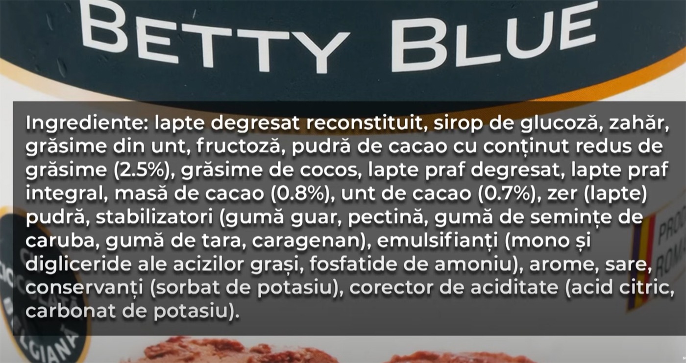 Dragoș Pătraru a analizat lista de ingrediente de la mai multe brand-uri de înghețată, iar printre acestea s-a numărat și celebra înghețată Betty Blue, varianta cu ciocolată. Iată din ce ingrediente este făcută aceasta.