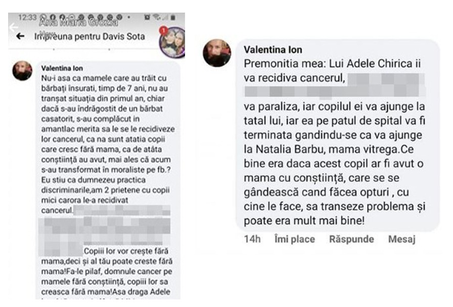 Adela Chirică, președinte al Asociației pentru Dravet si alte Epilepsii Rare, a mai dezvăluit că și două prietene ale ei au fost atacate, pe rețeaua de socializare, de aceeași ”fantomă”. ”Nu vreau să-i fac rău, însă are nevoie de tratament și de supraveghere. Le-a blestemat și pe cele care mi-au luat apărarea în fața ei în mediul online”, a încheiat Adela.