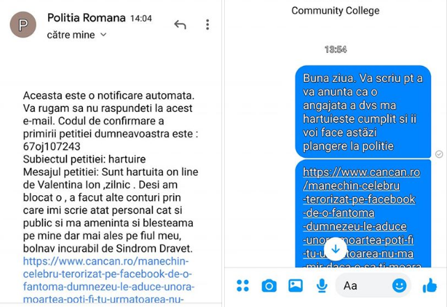 A continuat. ”Premoniția mea: Lui Adela Chirică îi va recidiva cancerul, va paraliza, iar copilul ei va ajunge la tatăl lui, iar ea pe patul de spital va fi terminată”, a scris femeia care nu-i dă pace fostului manechin. Au fost mesajele în urma cărora Adela Chirică s-a adresat Poliției. Nu înainte de a o descoperi pe ”fantomă” și a trimite o atenționare și către locul de muncă al acesteia. Apoi, a făcut, online, plângere la Poliție și a primit de acolo și răspunsul.