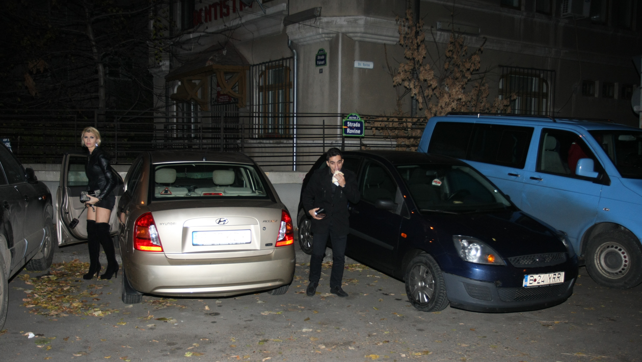 In timp ce deschide usa de la intrarea in bloc, Dragulescu mai ia o inghititura din micul dejun copios.