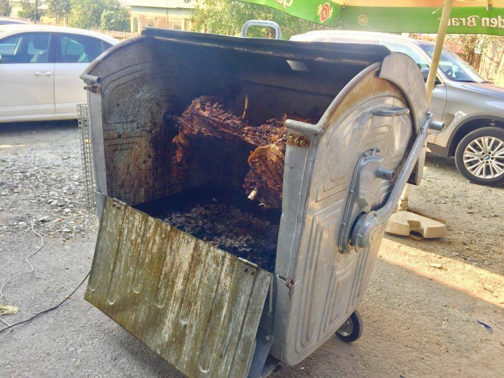 Fotografia a fost realizată pe 20 septembrie, în apropiere de Olteniţa. Internauţii s-au amuzat pe seama imaginii, dar se pare că modul acesta de preparare al proţapului în ghenă este foarte popular în anumite zone.