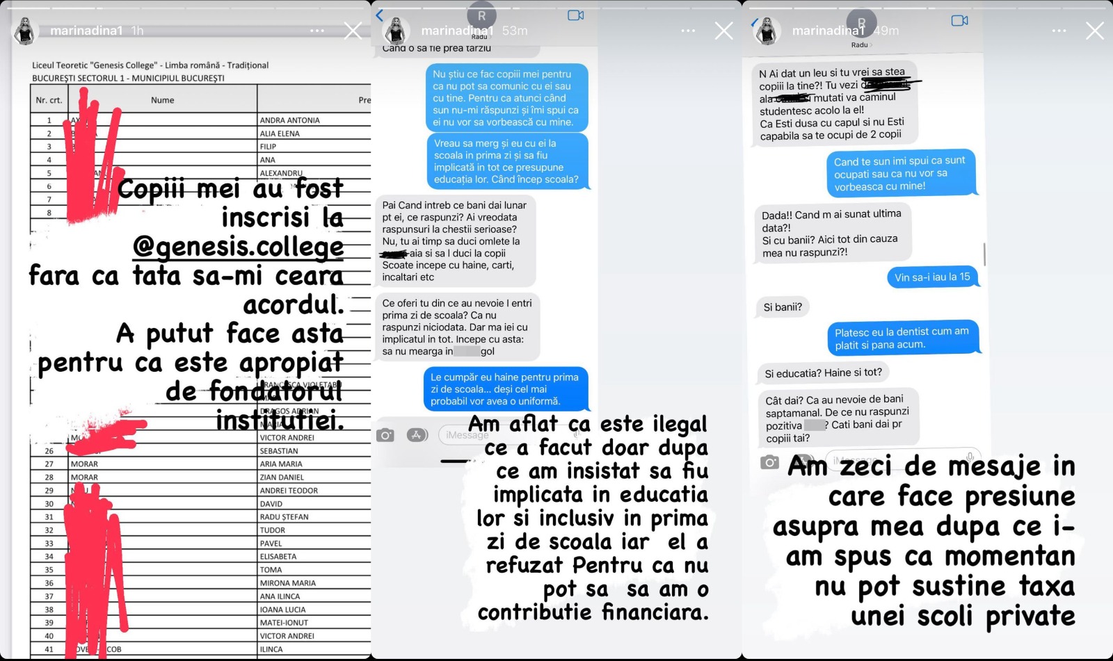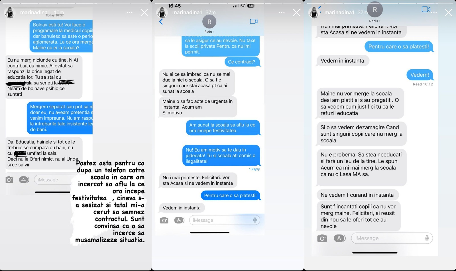 Am aflat că este ilegal ce a făcut doar după ce am insistat să fiu implicată în educația lor și inclusiv în prima zi de școală, iar el a refuzat pentru că nu pot să am o contribuție financiară. Am zeci de mesaje în care face presiuni asupra mea după ce i-am spus că momentan nu pot susține taxa unei școli private”, a scris Marina Dina în mediul online, postând și conversațiile pe care le-a avut cu fostul soț.