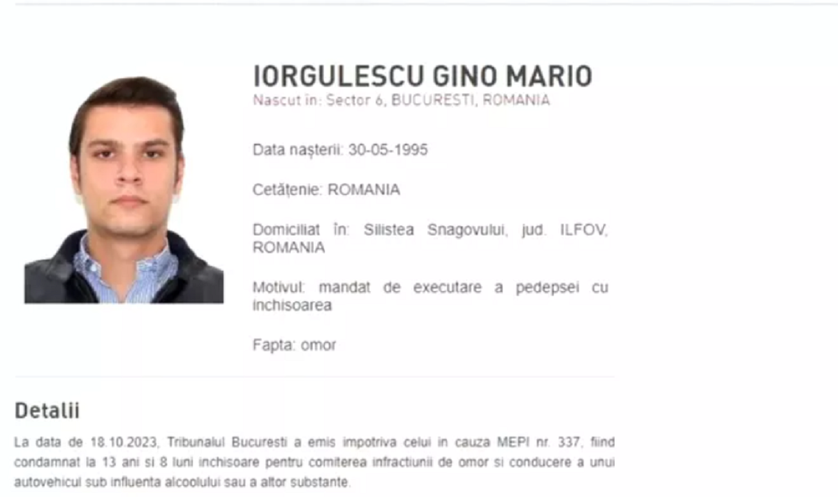 „La data de 18.10.2023, Tribunalul Bucureşti a emis împotriva celui în cauză MEPI nr. 337, fiind condamnat la 13 ani şi 8 luni închisoare pentru comiterea infracţiunii de omor şi conducere a unui autovehicul sub influenţa alcoolului sau a altor substanţe”, transmite Poliţia Română.