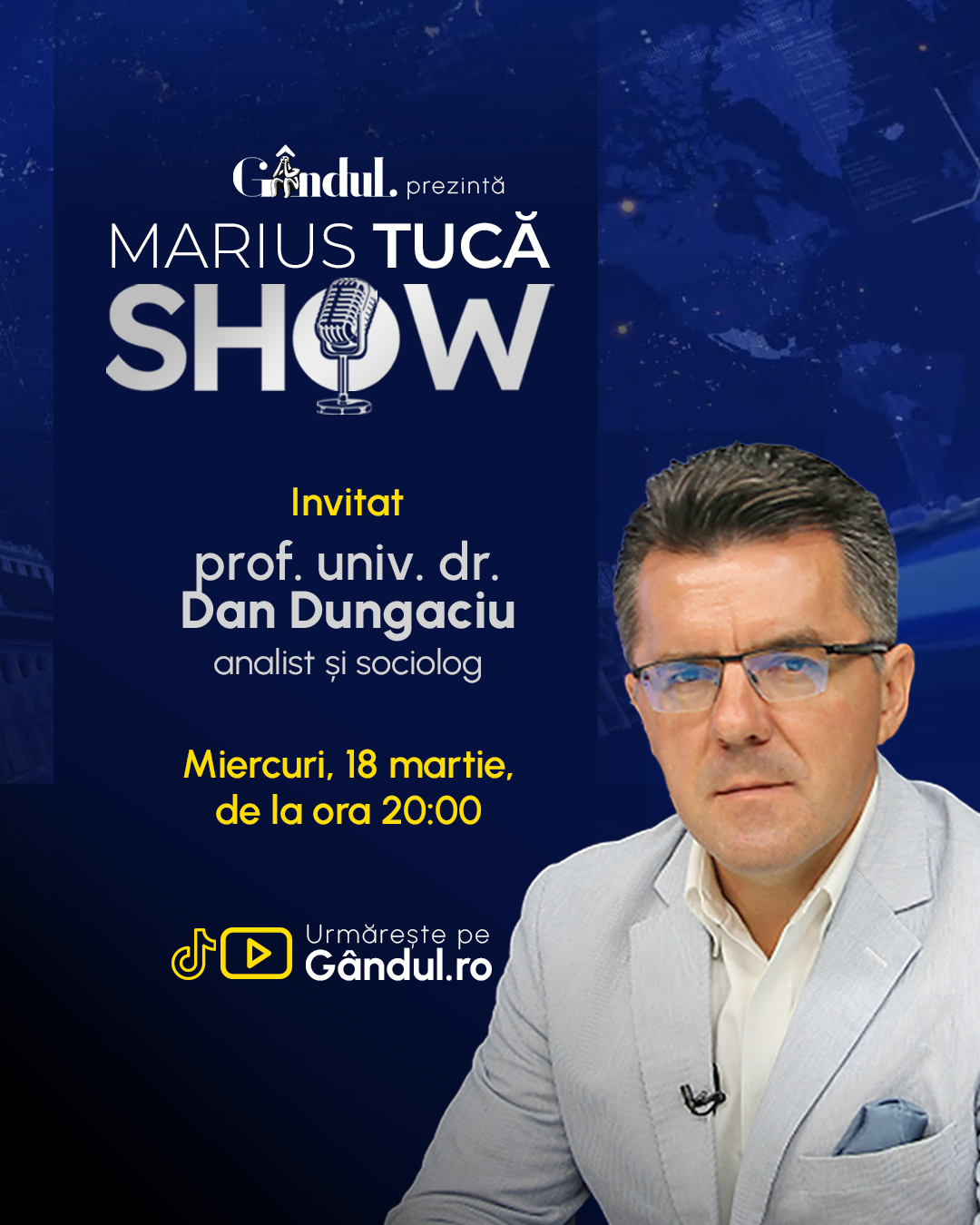 Acasă » Știri » Marius Tucă Show începe miercuri, 18 martie, de la ora 20.00, live pe Gândul. Invitat: prof. univ. dr. Dan Dungaciu
