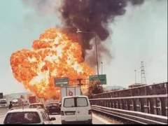 După câteva secunde a urmat o deflagraţie mult mai violentă, cu flăcări de zeci de metri şi o coloană imensă de fum. Cerul s-a înnegurat ca în toiul nopţii. La volanul unuia dintre TIR-urile staţionate în coloana se afla un român. Bărbatul a scăpat cu viaţa pentru că a sărit imediat din cabină. A suferit doar leziuni minore, fiind externat după doar câteva ore.
