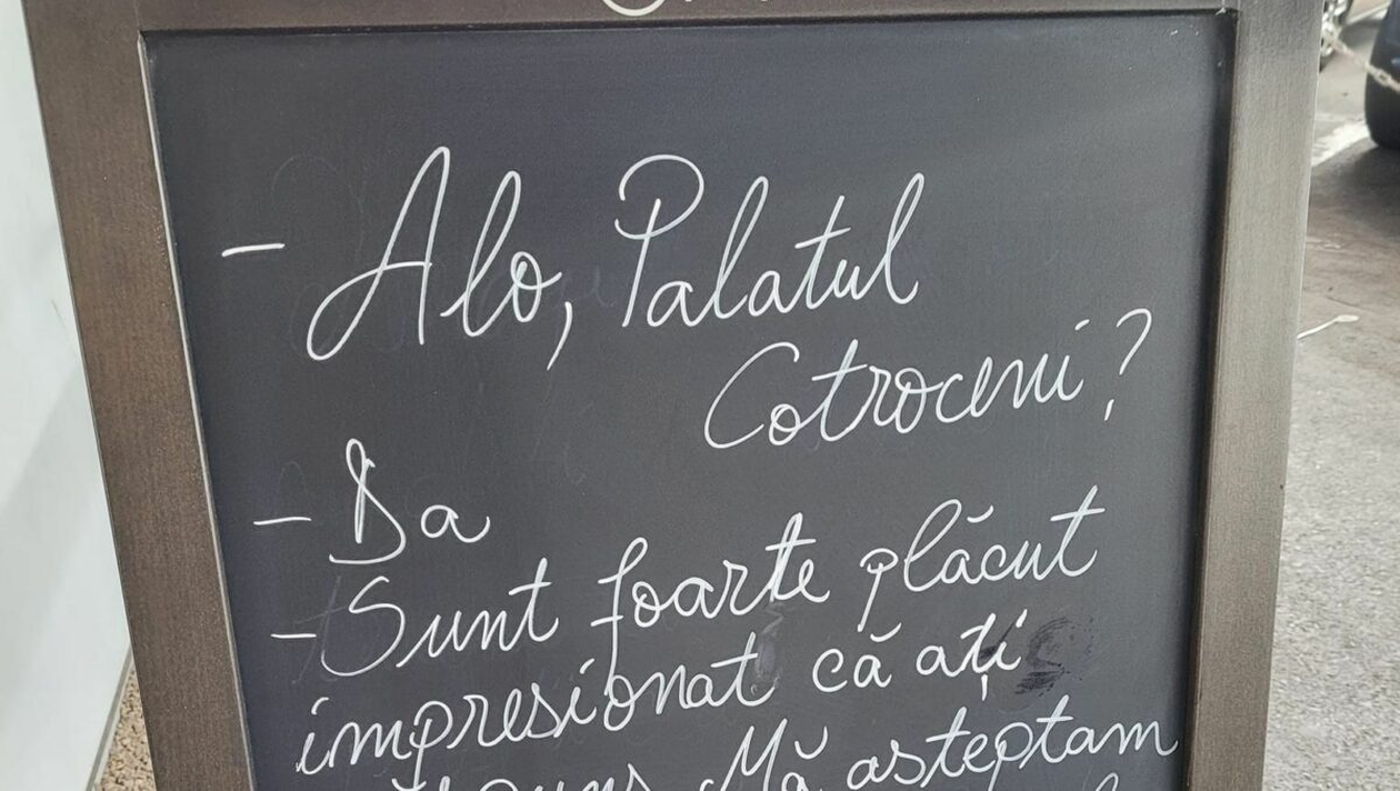 Angajații restaurantului din București au scris pe tăbliță o convorbire imaginară dintre o persoană și un reprezentant de la Palatul Cotroceni. Se presupune că discuția a avut loc prin intermediul telefonului. Ceea ce stârnește cu adevărat râsul este răspunsul angajatului de la Palatul Cotroceni, atunci când omul de la celălalt capăt al firului face o observație.