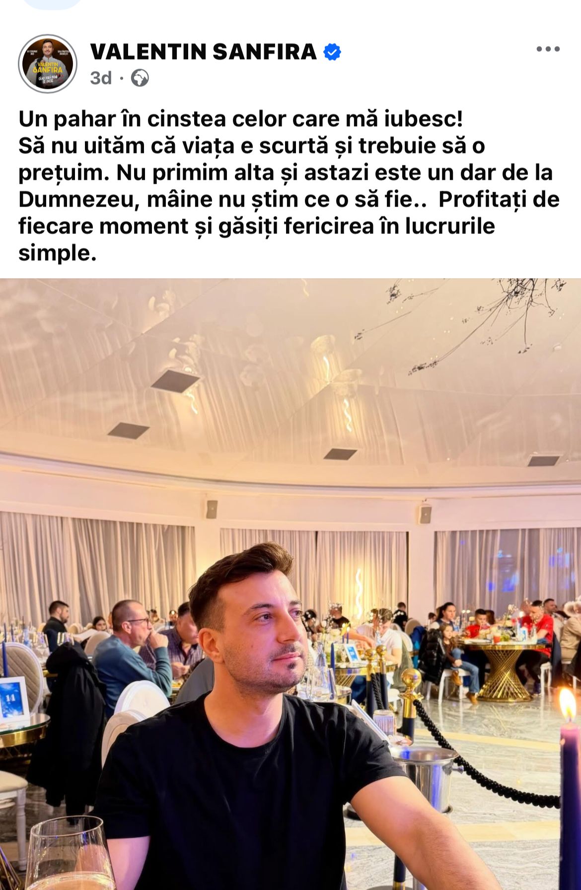 „Un pahar în cinstea celor care mă iubesc! Să nu uităm că viața e scurtă și trebuie să o prețuim. Nu primim alta și astazi este un dar de la Dumnezeu, mâine nu știm ce o să fie.. Profitați de fiecare moment și găsiți fericirea în lucrurile simple”, a fost mesajul postat de Valentin Sanfira, în urmă cu doar două zile.