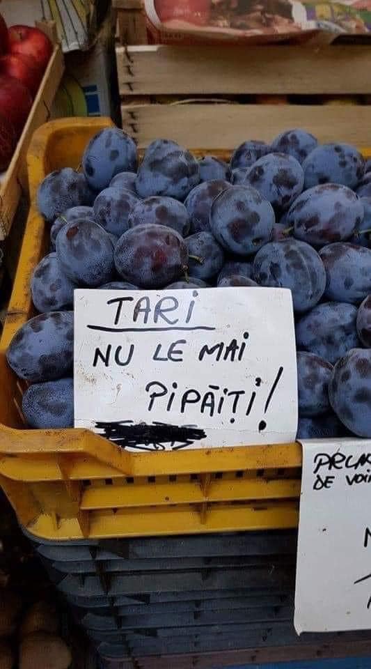 O imagine făcută într-o piață și postată pe pagina de Facebook Blogu lu’ Otrava s-a viralizat. Comerciantul vinde prune și, cel mai probabil sătul ca lumea să îi atingă fructele, a scris „Tari, nu le mai pipăiți”.