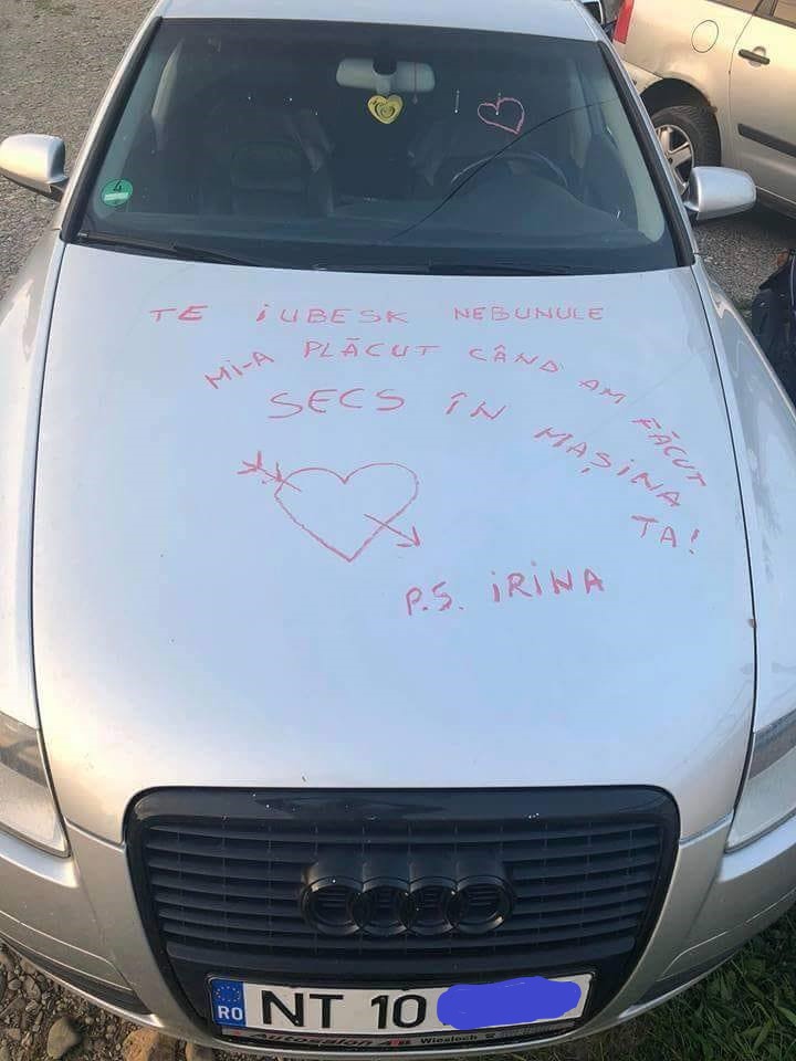 Mesajul de dragoste lăsat de o fată din Piatra Neamț pe capota mașinii iubitului ei