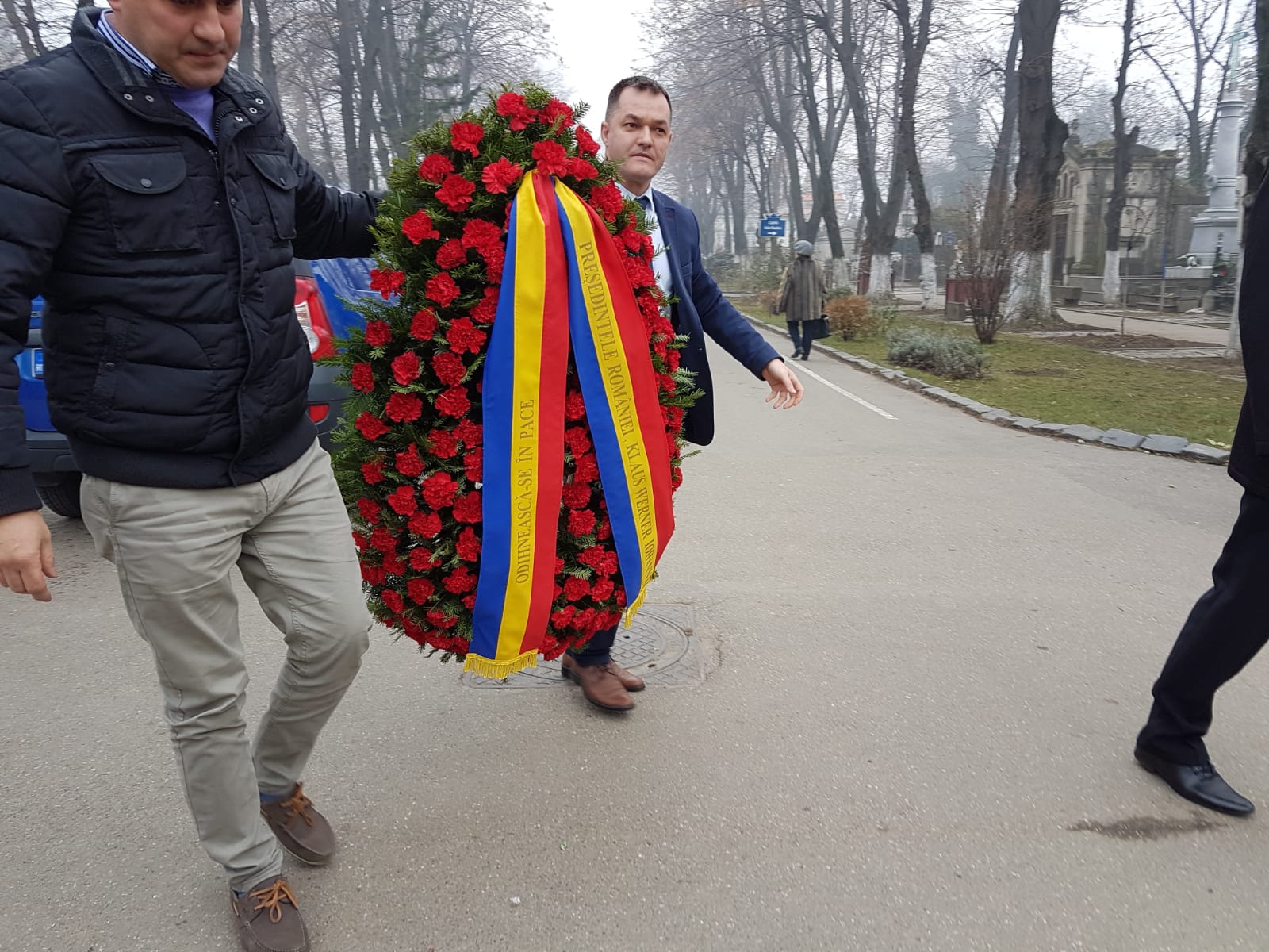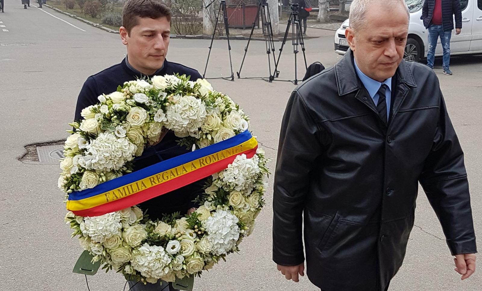 La Cimitirul Bellu din Capitală a ajuns o coroană imensă din flori albe, trimisă de Familia Regală a României. Aceasta avea atașat și drapelul țării.