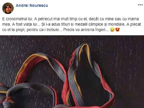 ”E cronometrul lui. A petrecut mai mult timp cu el, decât cu mine sau cu mama mea. A fost viața lui… Și i-a adus titluri si medalii olimpice și mondiale. A plecat cu el la piept, pentru că-i trebuie… Precis va antrena îngeri…”, a scris Andrei Nourescu.