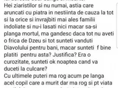 “Văd că toată lumea jubilează, toată lumea îşi doreşte doar sânge şi moarte! Hei, ziariştilor şi nu numai, ăştia care aruncaţi cu piatra, în neştiinţă de cauză, la tot şi la orice şi învrăjbiţi mai ales familii îndoliate şi nu-i lăsaţi nici măcar să-şi plângă mortul. Mă gândesc, dacă tot nu aveţi o frică de Dumnezeu şi tot sunteţi vânduţi Diavolului pentru bani, măcar sunteţi foarte bine plătiţi pentru asta? Justifică? Era o curiozitate, sunteţi OK noaptea când vă duceţi la culcare? Cu ultimele puteri, mă rog acum pe lângă acel copil care a murit, dar mă rog şi pentru viaţa copilului meu, care se zbate între viaţă şi moarte şi care înţeleg că vă doriţi foarte mult să moară. Dar vă pun o întrebare: se rezolvă ceva prin moartea lui?