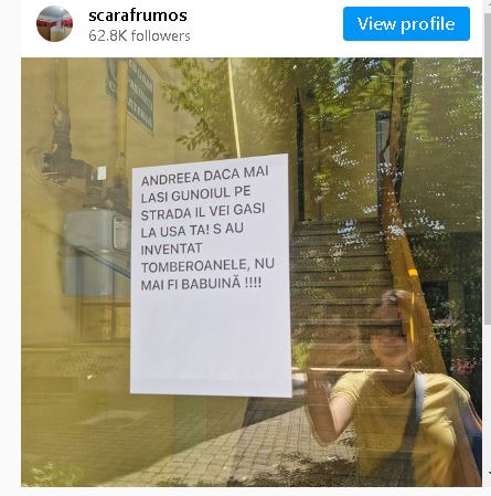 „Andreea, dacă mai lași gunoiul pe stradă îl vei găsi la ușa ta! S-au inventat tomberoanele, nu mai fi babuină!” – este mesajul lipit pe ușa de la intrarea în scara blocului.