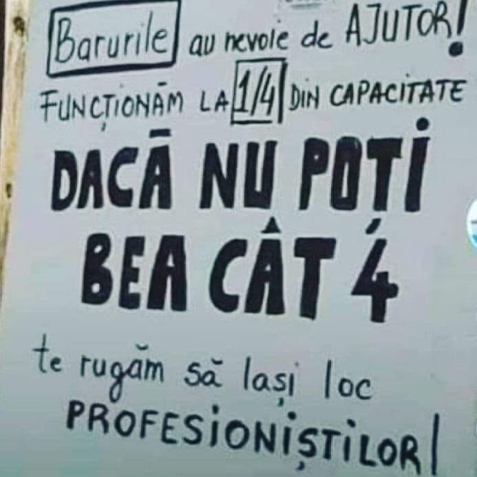 „Barurile au nevoie de ajutor! Funcționăm la ¼ din capacitate. Dacă nu poți bea cât patru, te rugăm să lași loc profesioniștilor!”, este mesajul ce stă la intrarea barului.