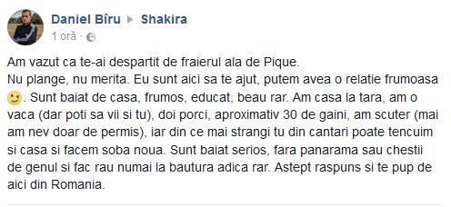 “Am văzut că te-ai despărţit de fraierul ăla de Pique. Nu plânge, nu merită. Eu sunt aici să te ajut, putem avea o relaţie frumoasă. Sunt băiat de casă, frumos, educat, beau rar. Am casă la ţară, am o vacă (dar poţi să vii şi tu), doi porci, aproximativ 30 de găini, am scuter (mai am nevoie doar de permis), iar din ce mai strângi tu din cântări poate tencuim şi casa şi facem sobă nouă. Sunt băiat serios, fără panaramă sau chestii de genul şi fac rău numai la băutură, adică rar. Aştept răspuns şi te pup de aici din România”, este mesajul transmis de Daniel B. celebrei artiste.