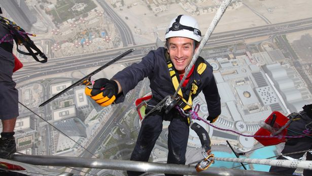 Burj Khalifa este cea mai inalta structura din lume facuta de mana omului. Constructia masoara 830 de metri si ca orice cladire invelita in sticla necesita o toaletare speciala la exterior.