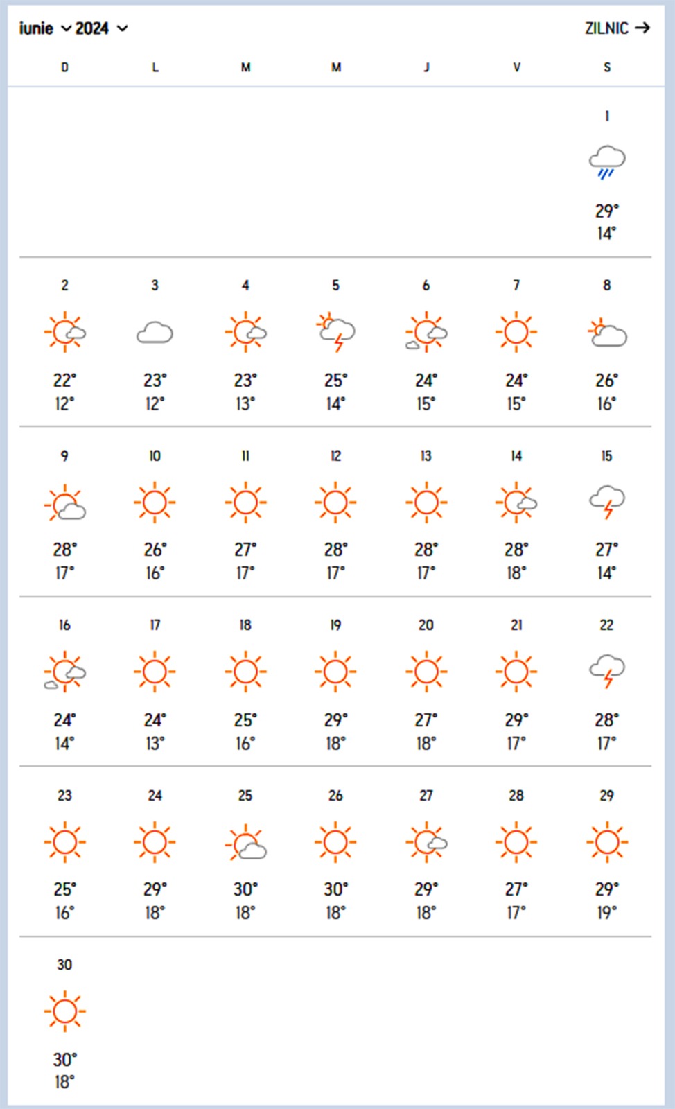 În a doua jumătate a lunii iunie se schimbă lucrurile. Valorile termice vor urca peste media celor normale în acea perioadă, dar și peste temperaturile care vor fi în luna iulie 2024. Luna lui Cuptor nu va fi la fel de călduroasă precum în anii trecuți. Se pare că sfârșitul lui iunie va fi mult mai însorit, cu temperaturi mai mari, decât iulie.