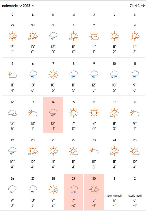 În lunile noiembrie și decembrie, temperaturile vor fi cu un grad, un grad și jumătate mai ridicate decât media obișnuită a acestei perioade. Aceste fluctuații de temperatură vor fi însă insesizabile pentru oameni. Totodată, luna noiembrie va aduce și prima temperatură sub 0 grade Celsius în București. Mai exact, în noaptea dinspre 14 spre 15 noiembrie, temperatura va scădea la -1 grad Celsius.