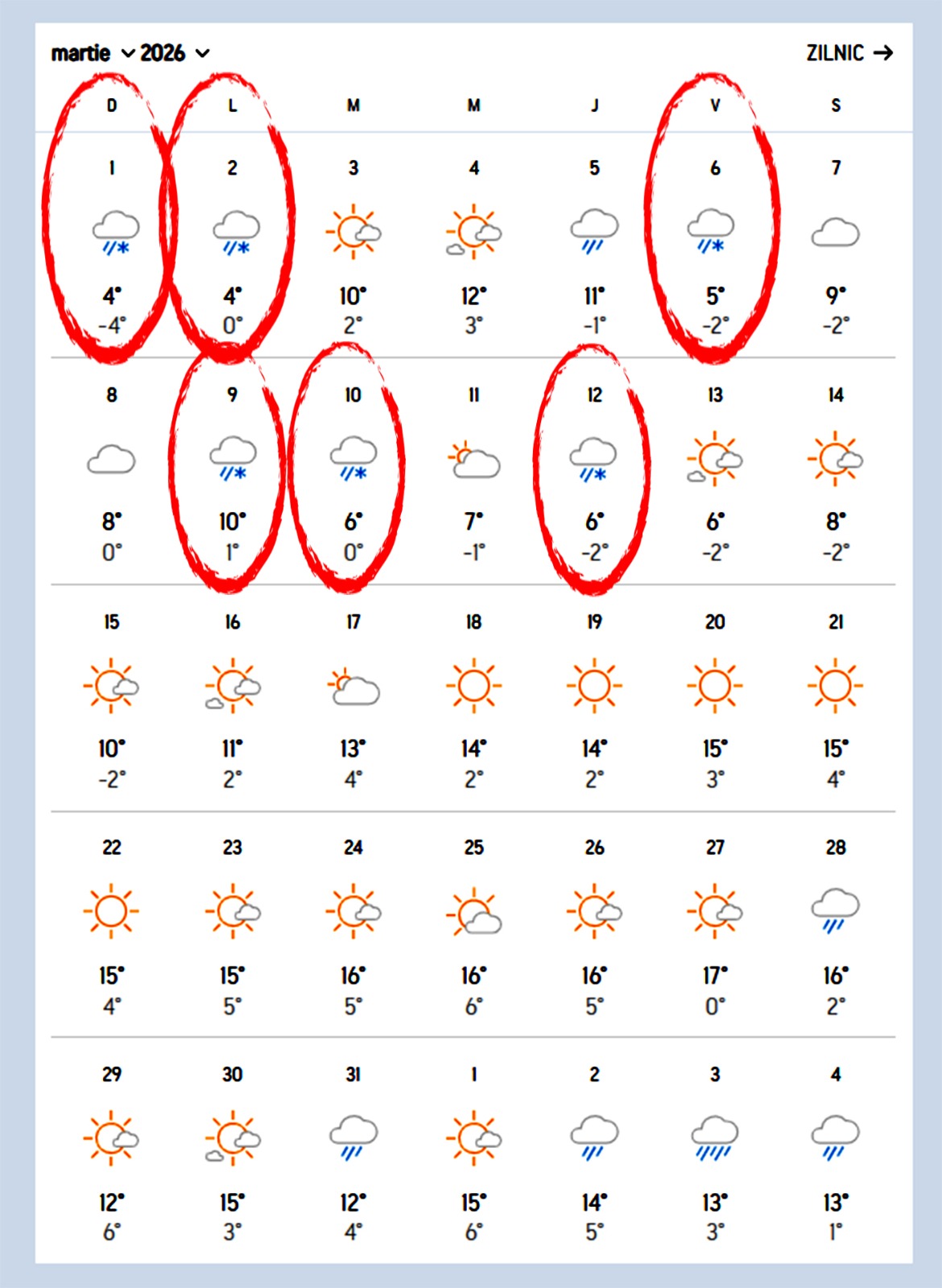 În aceste intervale, temperaturile vor oscila între 4 și 10 grade Celsius, cea mai ridicată valoare fiind înregistrată pe 9 martie. După aceste zile reci, vremea se va îmbunătăți treptat, iar soarele va deveni tot mai prezent. Temperaturile vor urca până la 15-16 grade Celsius, oferind un contrast puternic față de începutul lunii și marcând o revenire treptată la condiții mai apropiate de sezonul de primăvară.