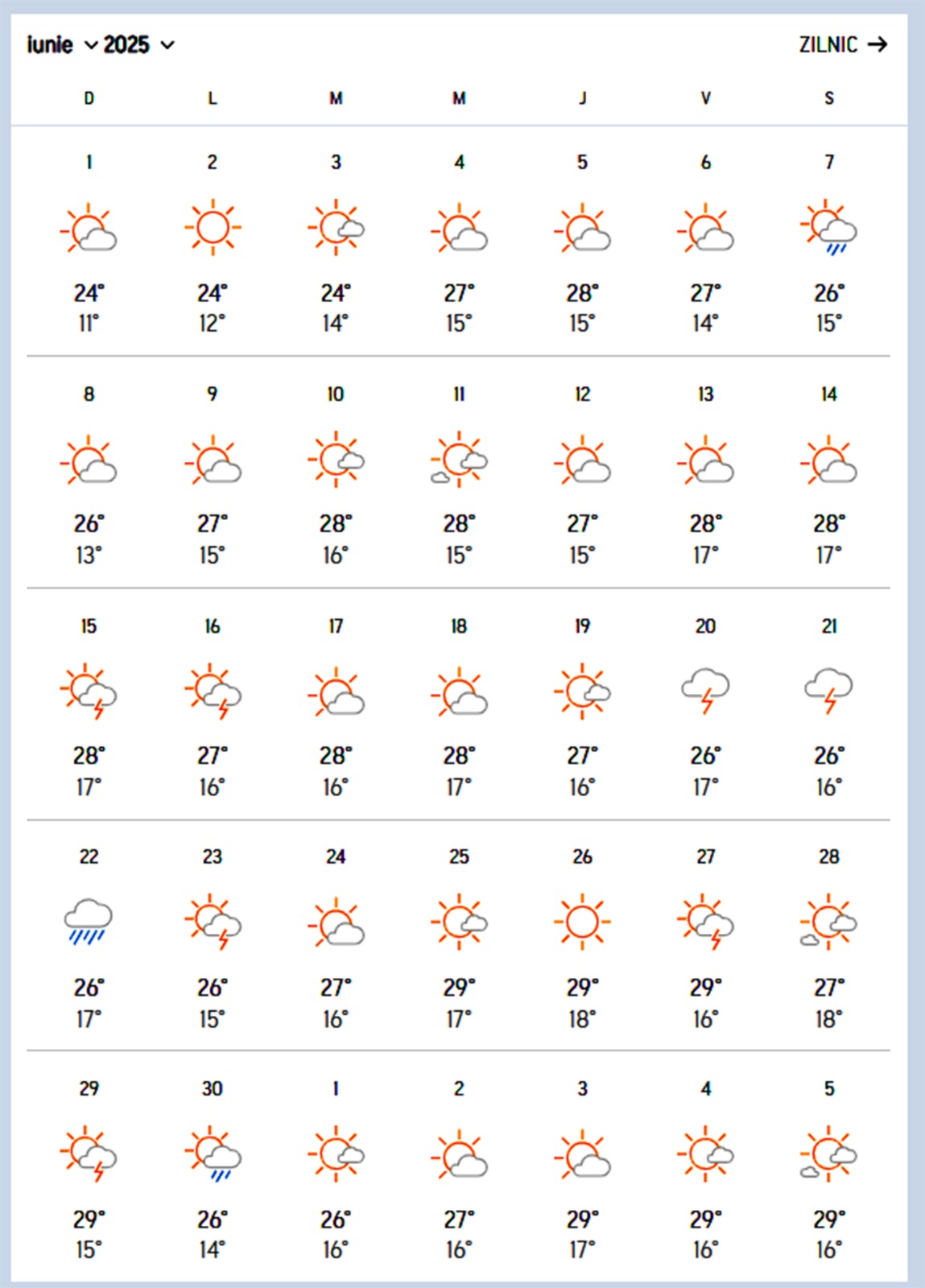 Informațiile disponibile pentru prima jumătate a lunii iulie continuă tendința începută în iunie. Zilele toride par să întârzie, iar valorile termice rămân sub media ultimilor ani. Temperaturile vor oscila între 28 și 33 de grade, dar vor fi mult mai ușor de suportat decât în verile anterioare. De asemenea, începutul lunii iulie va păstra același caracter ușor instabil al vremii: sunt anunțate noi perioade de ploi scurte, dar intense, tipice sezonului cald.
