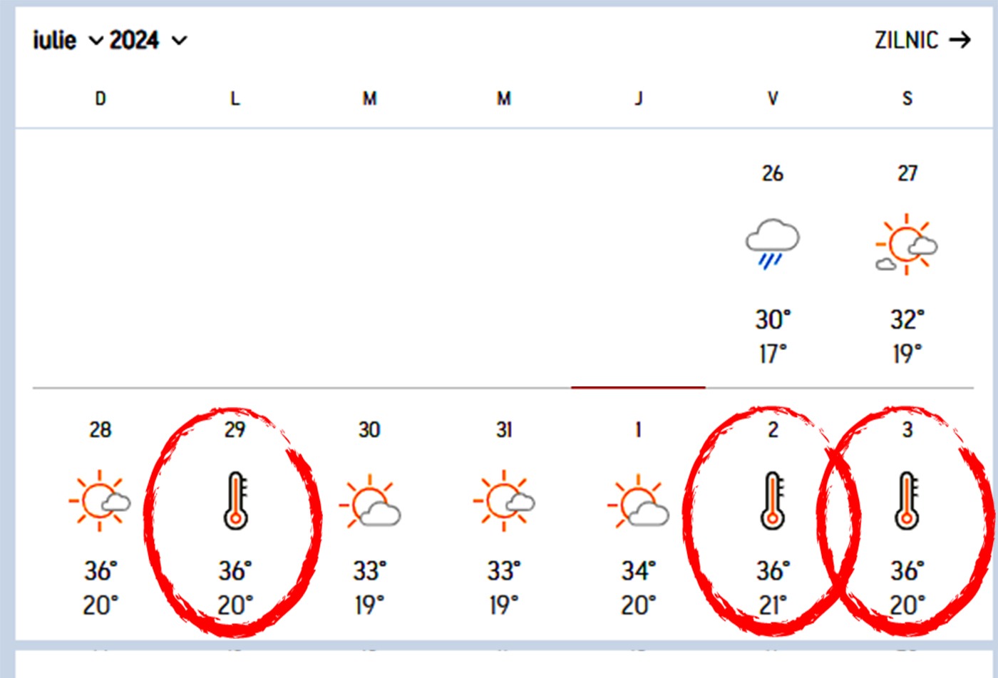 Duminică, 28 iulie, temperaturile maxime ating 36 de grade Celsius, iar minimele vor fi de 20 de grade Celsius. Totuși, în București, cerul o să fie înnorat. În schimb, de luni, 29 iulie, meteorologii Accuweather anunță că se întoarce canicula în România.