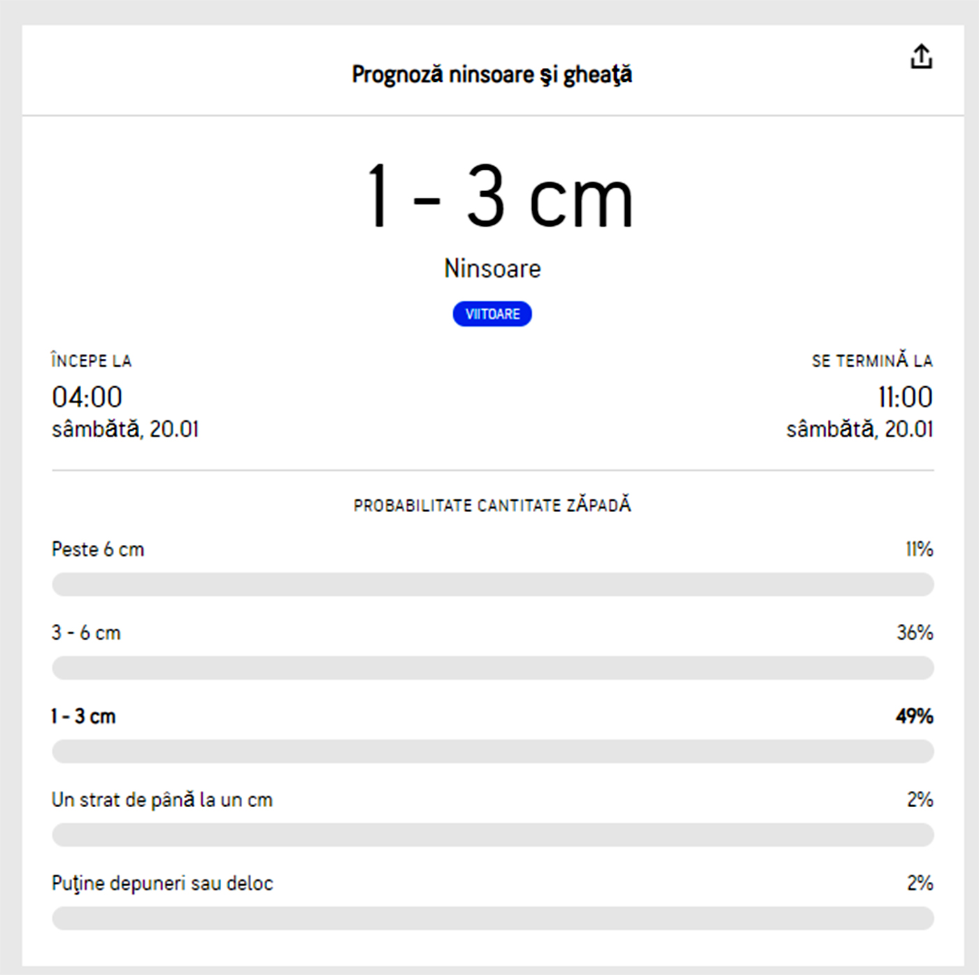 În noaptea de vineri spre sâmbătă – 19 spre 20 ianuarie 2023- sunt așteptate precipitații sub formă de lapoviță, după care ninsori. Meteorologii Accuweather au emis o avertizare meteo de vreme rea și ninsori în București. O să ningă sâmbătă, 20 ianuarie 2023, de la ora 7:00 la ora 11:00. Duminică, 21 ianuarie 2023, vremea rămâne rece cu maxime de 1-2 grade Celsius și minime apropiate de pragul înghețului.