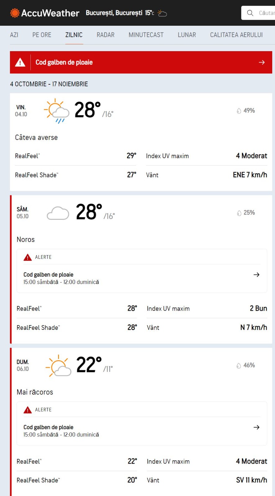 Vineri, 4 octombrie 2024, vremea rămâne caldă în București, cu maxime de 29 de grade Celsius. Începând de sâmbătă, 5 octombrie 2024, de la ora 15:00, până duminică la ora 12:00, vremea se răcește și devine instabilă. Meteorologii Accuweather au emis un cod galben de ploi abundente în Capitală.