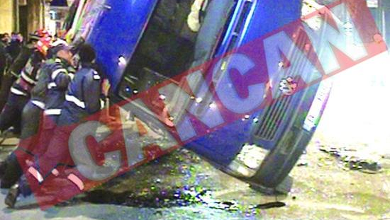 PAGUBE. In urma impactului, masina SRI s-a rasturnat si a dat batai de cap pompierilor si politistilor care s-au chinuit cot la cot pentru a o repune pe roti Un microbuz al SRI s-a rasturnat, duminica seara, in Bucuresti, dupa ce a fost lovit de o masina de transport valori al carei sofer ar fi trecut pe rosu. Incidentul s-a produs in jurul orei 22.30, la intersectia bulevardului Mihail Kogalniceanu cu strada Vasile Parvan, dupa ce soferul masinii blindate a ignorat semaforul si a izbit violent Volkswagen-ul SRI. In urma impactului, acesta si-a spart capul, insa nu a fost nevoie de internare. (A.D.)