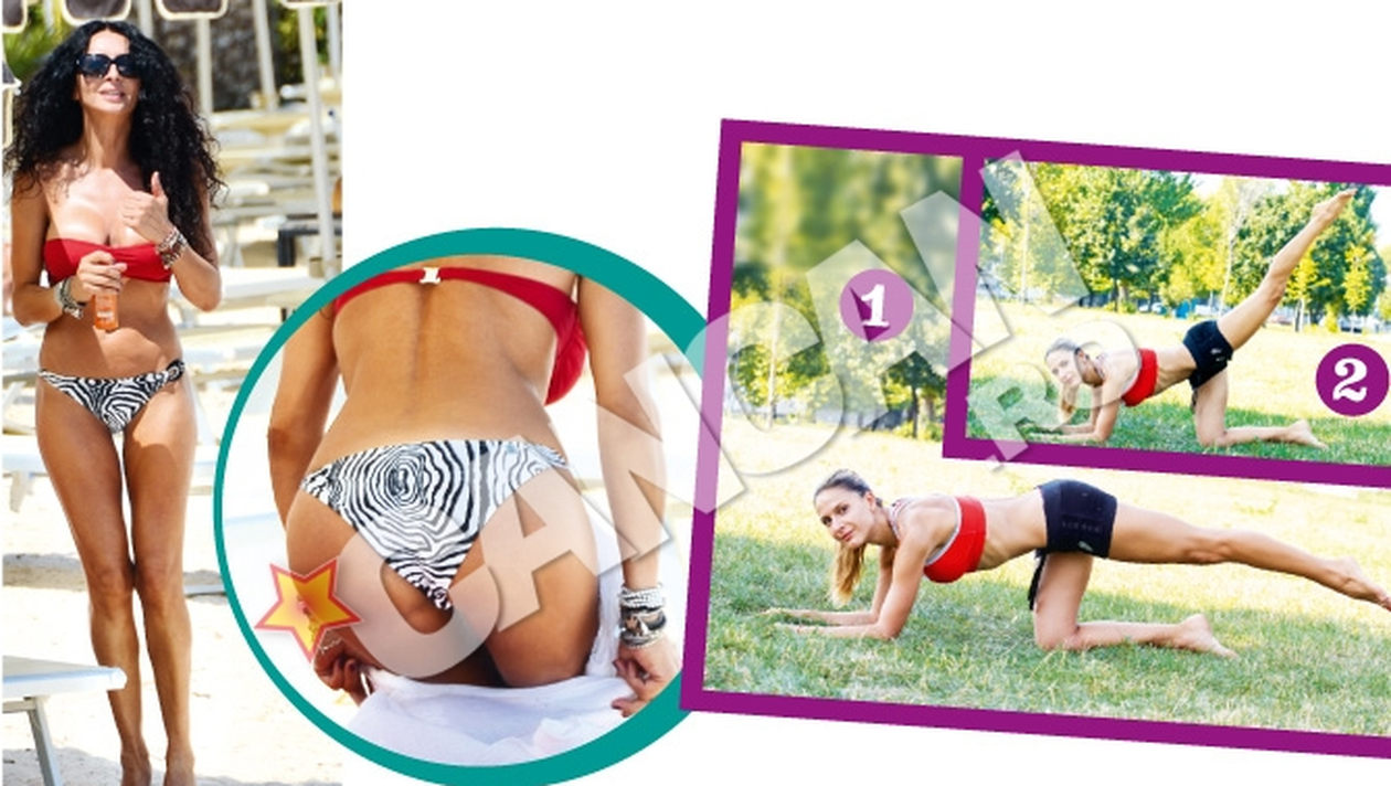 Mihaela Radulescu, 43 de ani, 53 de kilograme - are o silueta impecabila, o musculatura fina, feminin evidentiata - Pentru fesieri stai in genunchi, cu sprijin pe coate, piciorul intins inapoi, ridica si coboara lent piciorul, mentinand spatele fixat si drept