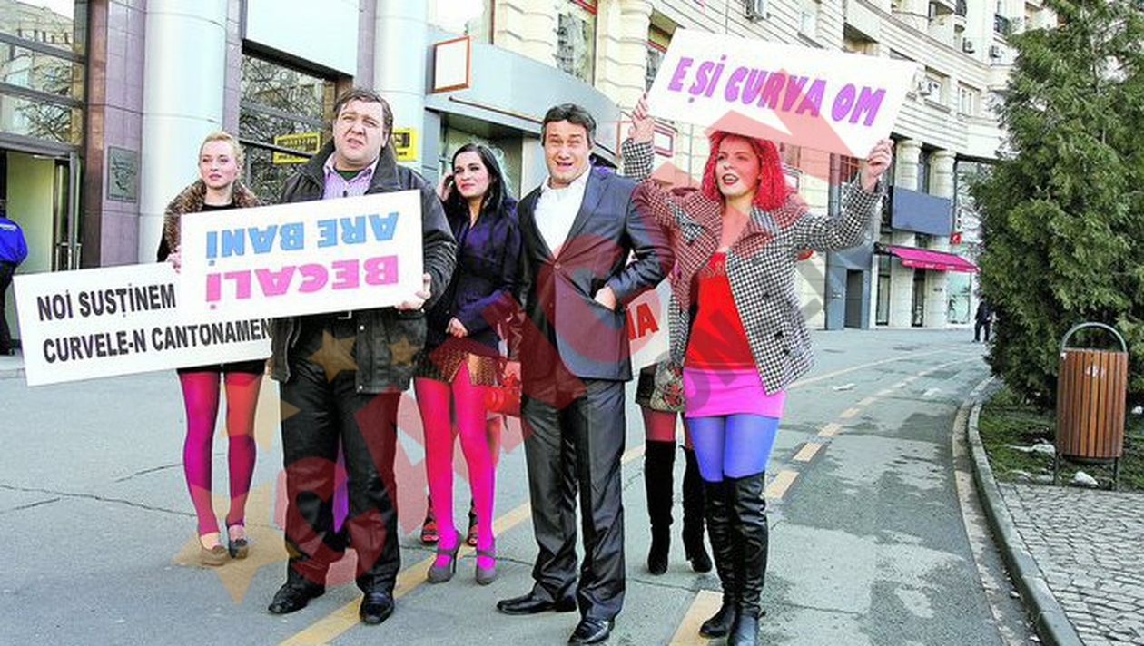 Actorul Mihai Bendeac povestea la inceputul acestui an pe blog cum si-a petrecut noaptea de Revelion cu o fata despre care a aflat ca este prostituata. La trei luni de la aceasta experienta, actorul s-a gandit probabil ca si fetele de trotuar trebuie sa lucreze intr-un cadru legal, asa ca a iesit in strada pentru a milita pentru legalizarea prostitutiei. Sau poate se simtea dator fata de fata care nu i-a luat niciun leu in noaptea de Revelion. Deghizat in Gigi Becali si insotit de mai multe tinere, Bendeac a filmat pe strada o scena pentru emisiunea „In puii mei”, care va fi difuzata sambata la Antena 1. „Legalizati prostitutia” sau „E si curva om” scria pe doua dintre pancartele pe care fetele care jucau rolul prostituatelor le fluturau deasupra capului. Si cum actorul il interpreta pe Gigi Becali, finantatorul Stelei, pe una din pancarte scria: „Noi sustinem vehement curvele-n cantonament”. Intr-unul dintre mesaje se facea referire si la Gigi: „Becali are bani”.