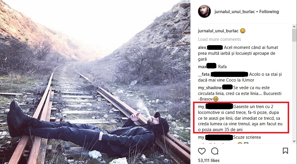 „Asta chiar mă sperie”, „Hei!!! Hai în picioare!!!”, „Nu, nu…!!! Ridică-te de-acolo… nu fii tâmpit… haha… Super tare poza!!..;)”, „Mai degrabă ai sansa să te lovească un fulger acolo decât să te calce trenul…”, „Suflet de aur. Cand ai coborat de pe scena la «iUmor»sa il imbratisezi pe Micutzu, mi-am dat seama cat de tare te atasezi de oamenii la care tii. Iiar cand acel rezident a facut misto cu «oncologia», iar Cheloo a spus ca mama lui a murit de cancer, te-am vazut ce te-ai consumat. Se vede pe tine ca ții cu adevarat la oamenii apropiati. Sunt fericiti cei care te au ca prieten. Mult succes mai departe” sunt trei dintre comentariile lăsate de prietenii virtuali.