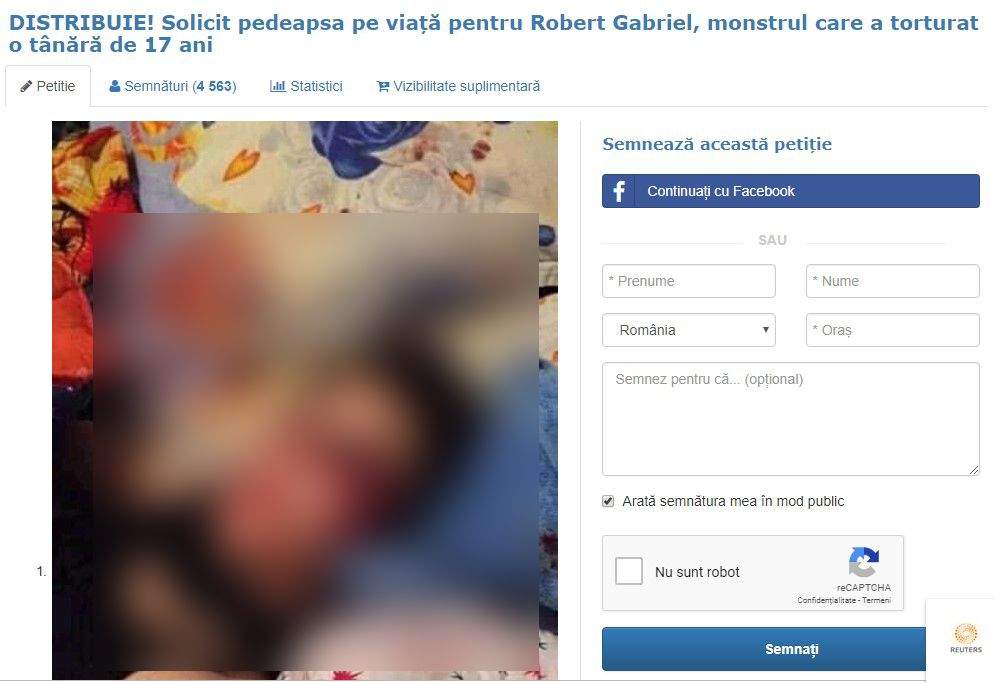 Pe Facebook a fost lansată o petiție online în care se cere pedeapsa pe viață pentru Robert Gabriel Berechet, după ce acesta și-a torturat fără milă fosta iubită, care ieri a împlinit vârsta majoratului. În scurt timp de la inițiere, petiția s-a viralizat și a strâns aproape 5.000 de semnături în doar câteva ore. În prezent, iubitul-călău din Ploiești se află în spatele gratiilor, în timp ce victima lui s-a întors la mama ei acasă, în județul Buzău.